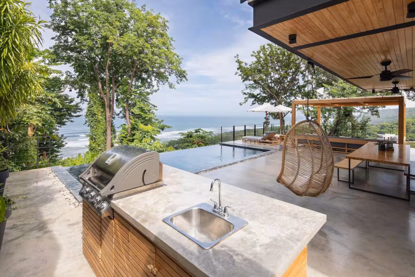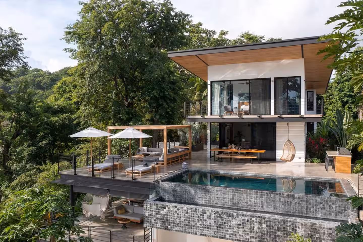 The ground floor offers a gourmet kitchen and BBQ area, ideal for sunset dinners under the stars. Upstairs, three additional bedrooms showcase panoramic ocean and jungle vistas.