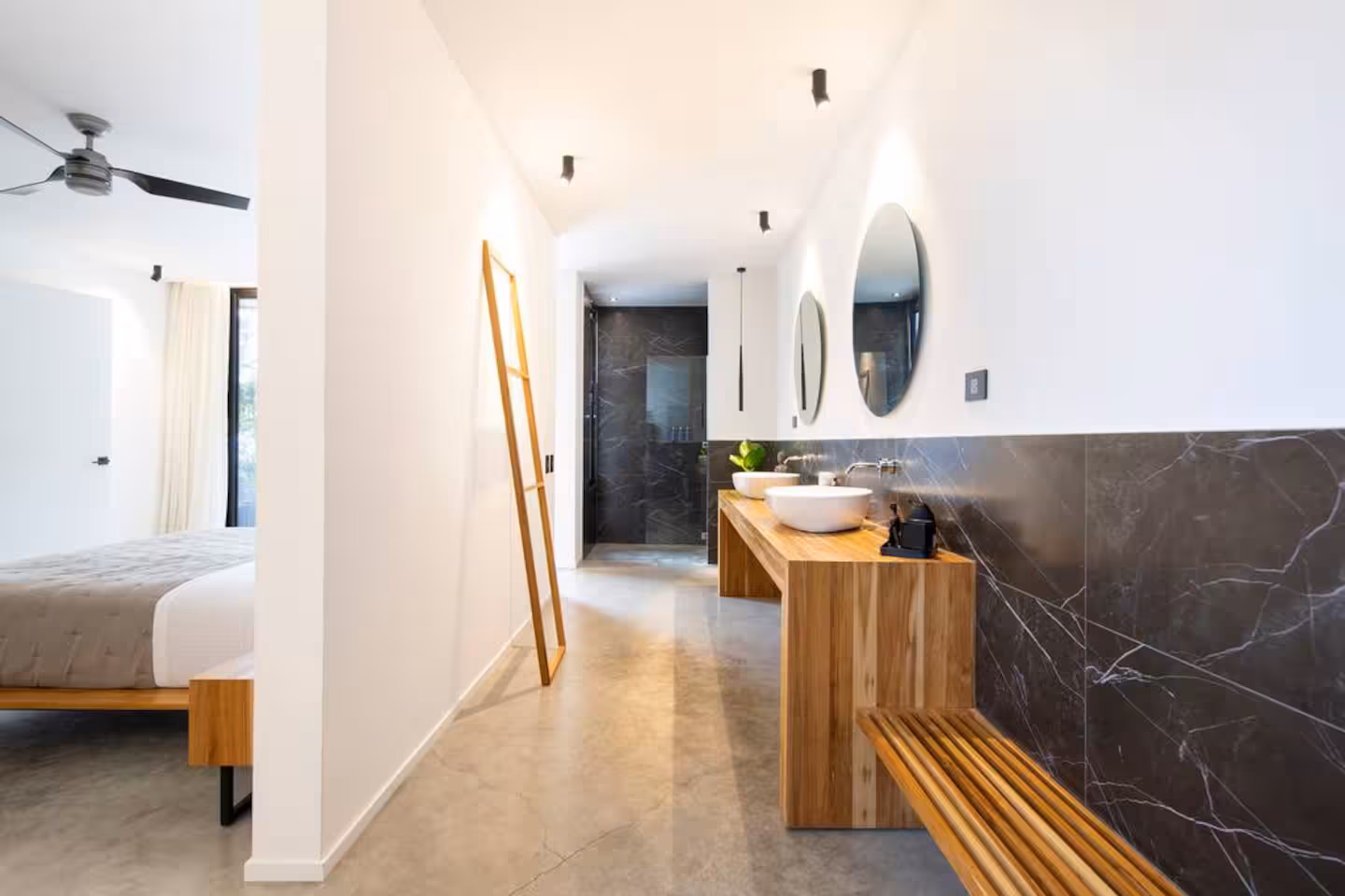 Villa Nof Yam offers four master bedrooms, each a private sanctuary with king-size beds, en-suite bathrooms, and mesmerizing ocean views. The villa's expansive 300 sqm outdoor deck, complete with an infinity pool, seamlessly blends indoor and outdoor living.